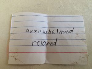 After group introductions, I asked everyone to find a slip of paper and write down how they were feeling at that moment. We then dove into discussions and planting activities. In closing, I asked them to find the paper and write down how they were feeling now. I had intended this to be a private experience, so was surprised when one participant stopped and handed me her scrap of paper. She wanted me to see her words – “overwhelmed” and “relaxed.” As I handed the slip back to her, she said no, I want you to keep it; I want you to know how much this has meant to me. I still have that torn, dirty scrap of paper.
