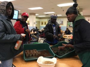 The Stewpot is a Dallas program “offering a safe haven for homeless and at-risk individuals.” The garden club is one of several resources for participants to join. Others are art, music and journaling. Food, medical care, dental care, hygiene kits, mail services, ID cards and casework are additional services available. All are located downtown in a two-storied, recently renovated space with offices and a large room for congregating around tables.